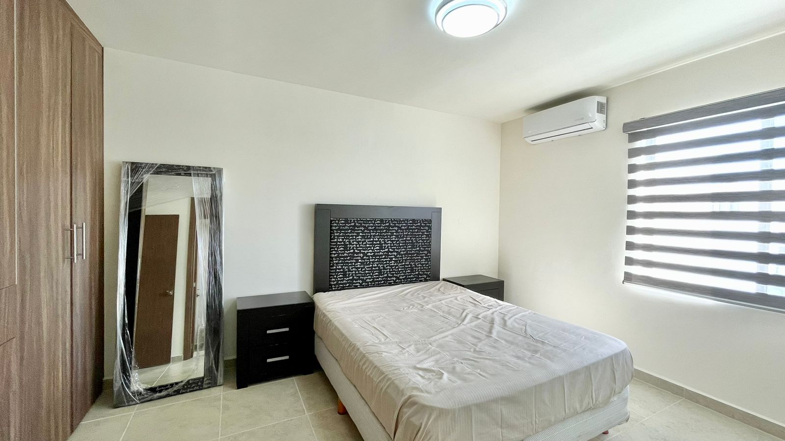 Sala con dos sillones, comedor de seis sillas, cocina con refrigerador de dos puertas, placa de inducción, horno de micro ondas, tres recámaras con buros, lámparas y espejos y pantalla en estancia.