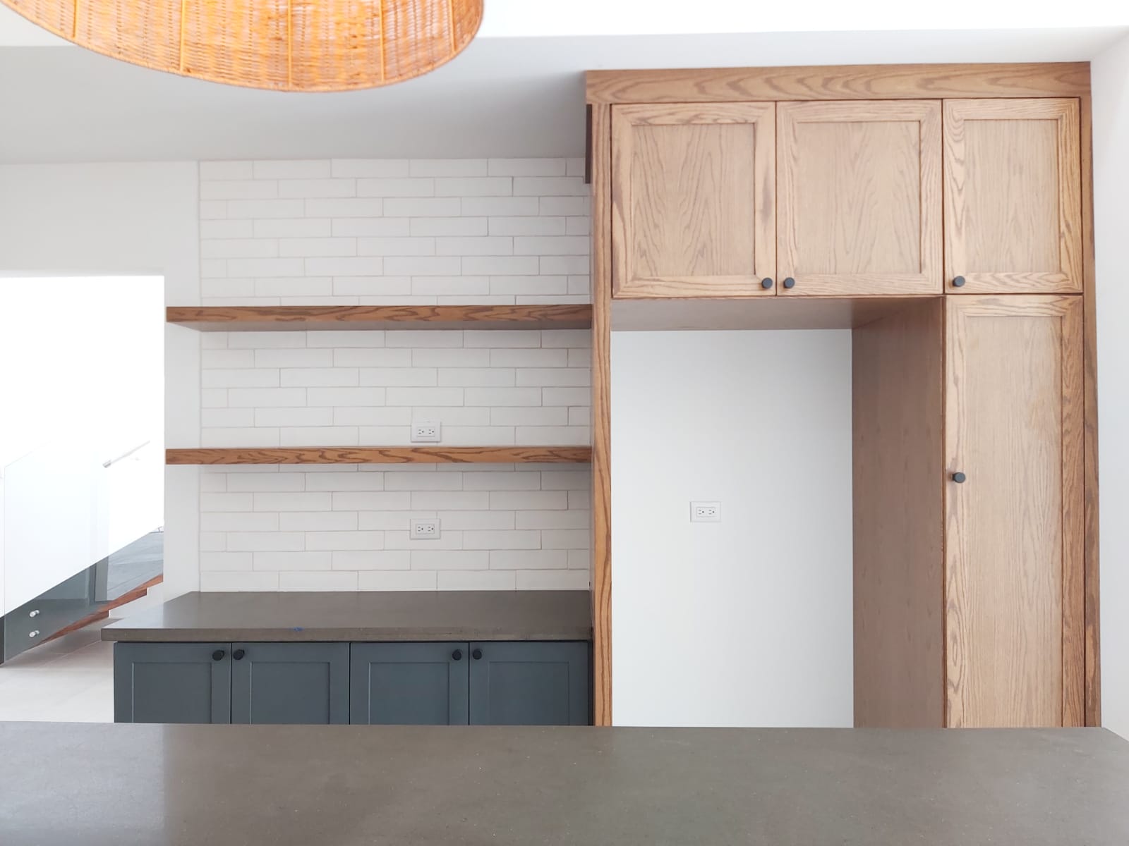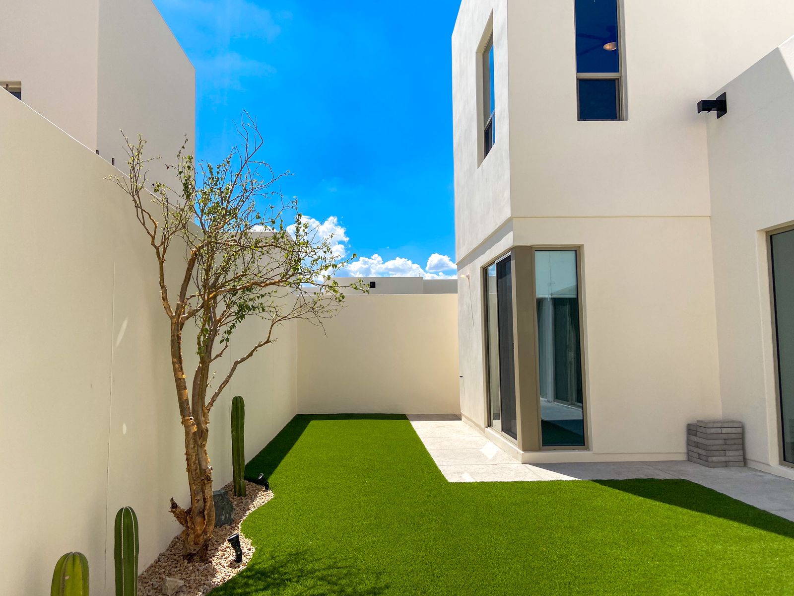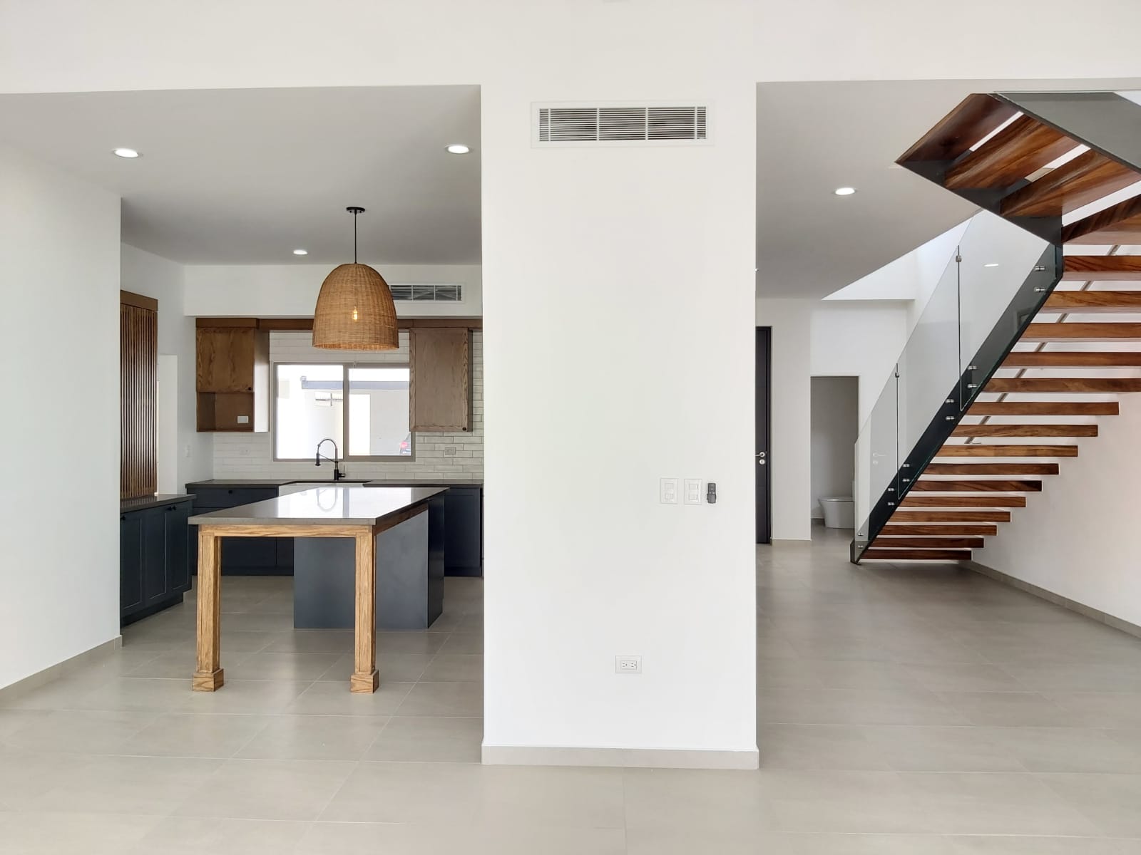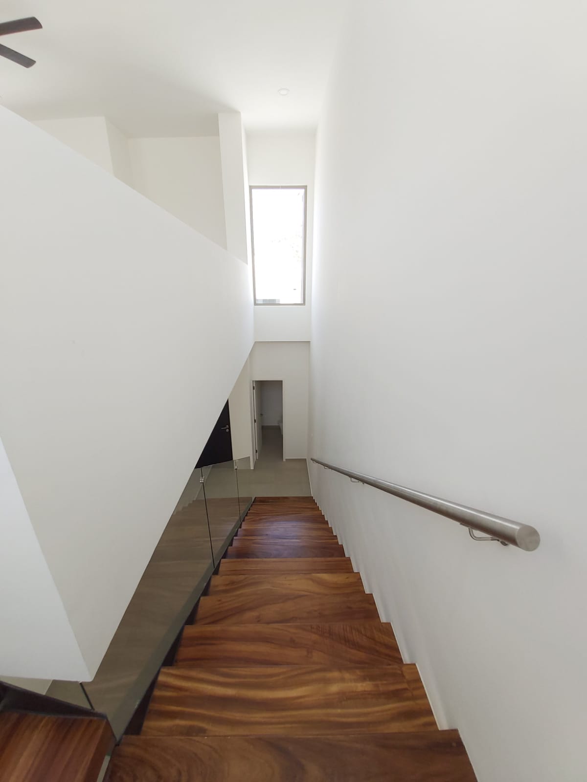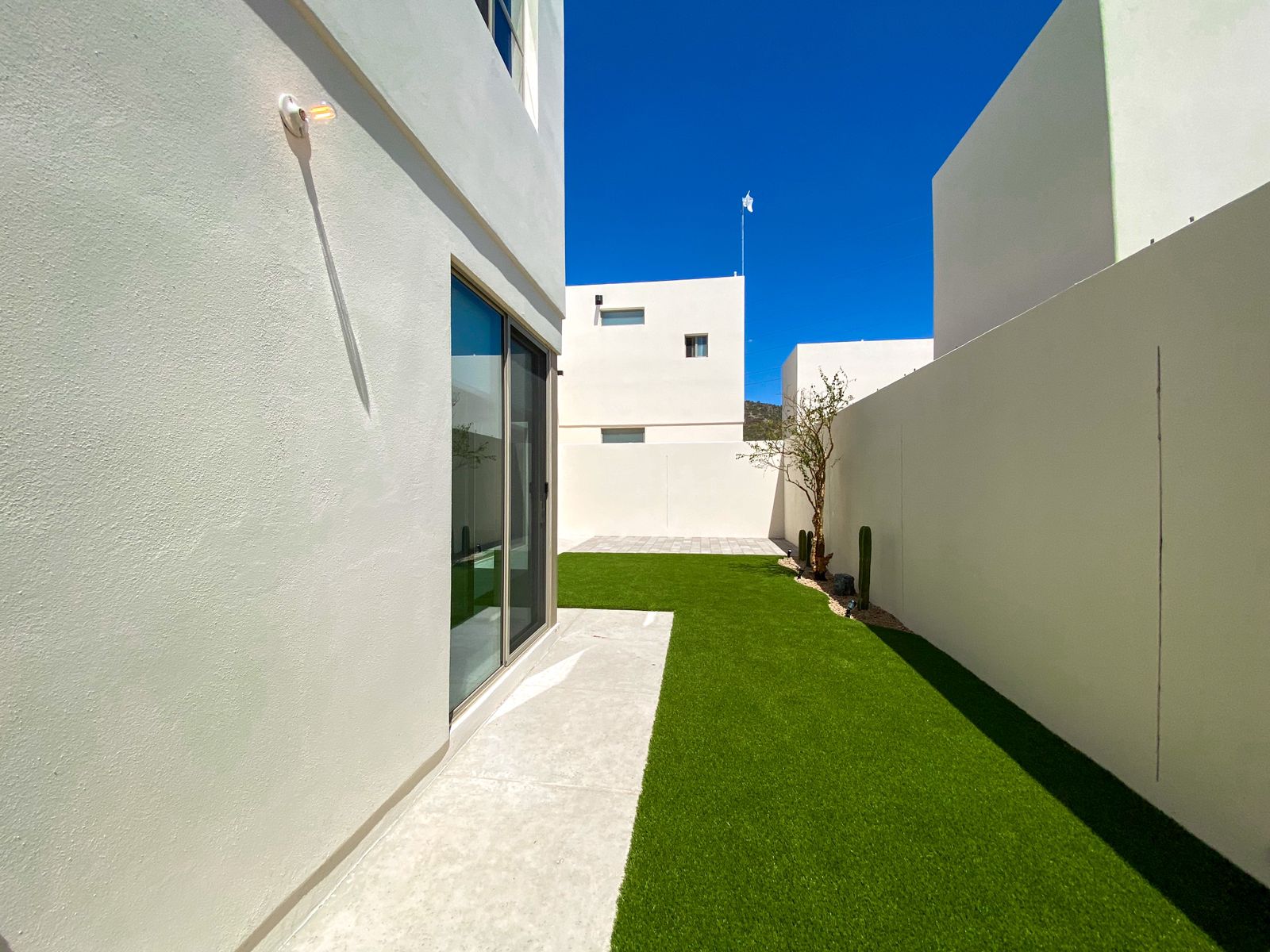 Recibidor, sala, comedor, cocina integral con estufa y campana, alacena, recámara con baño y walk-in clóset, medio baño visitas, lavandería, cuarto de servicio con baño completo, cochera techada para 3 autos, pasillo de servicio y un amplio patio con adoquín y pasto artificial.