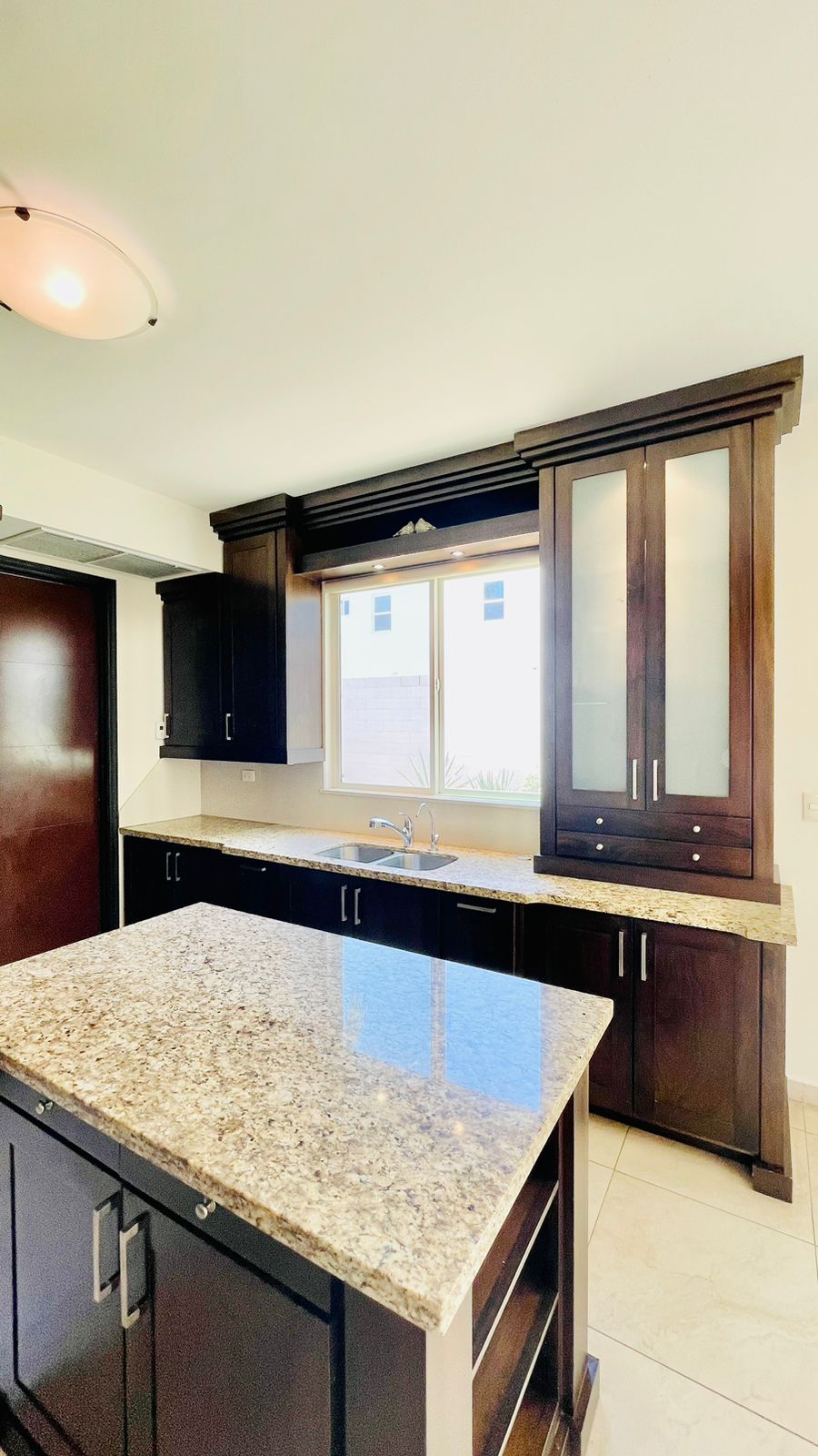 Cocina integral con cubierta de granito, vestidores en las 3 recámaras, persianas, alarma, dos equipos de refrigeración central de 4 y 5 toneladas, cisterna e hidroneumático