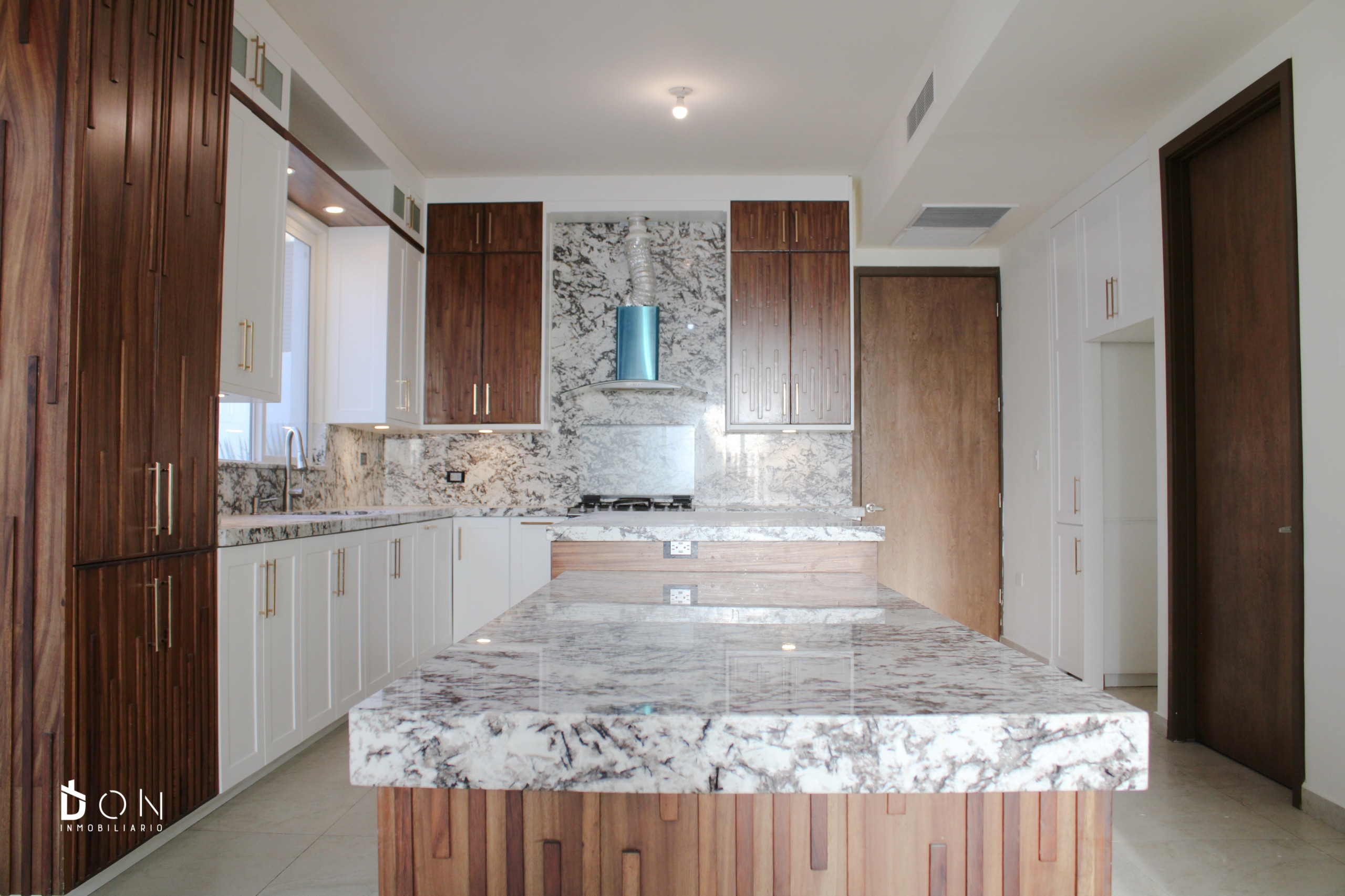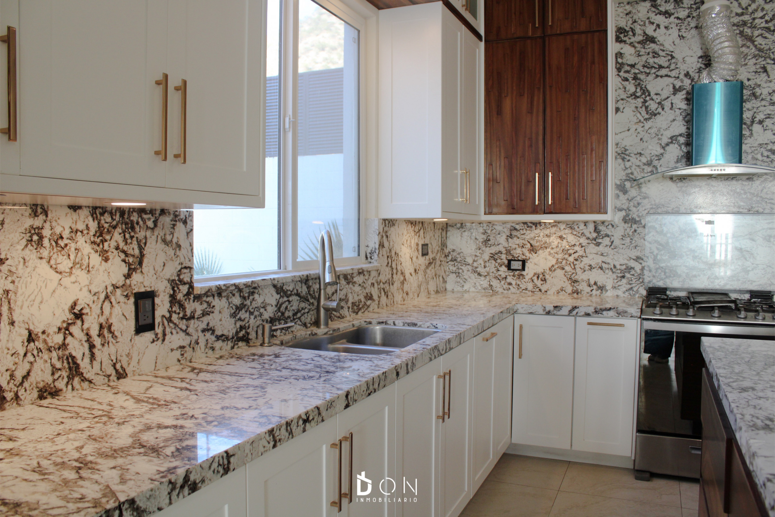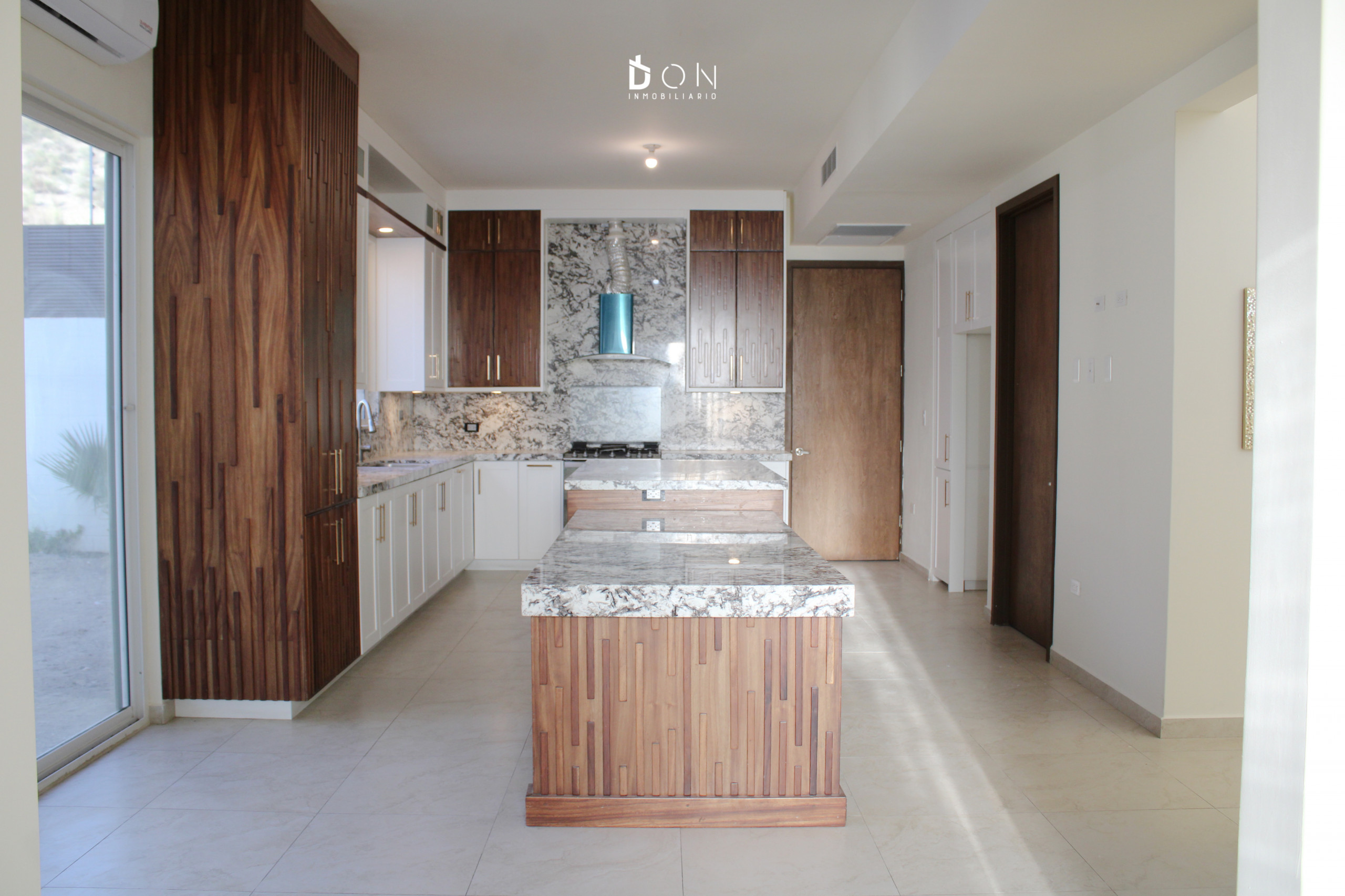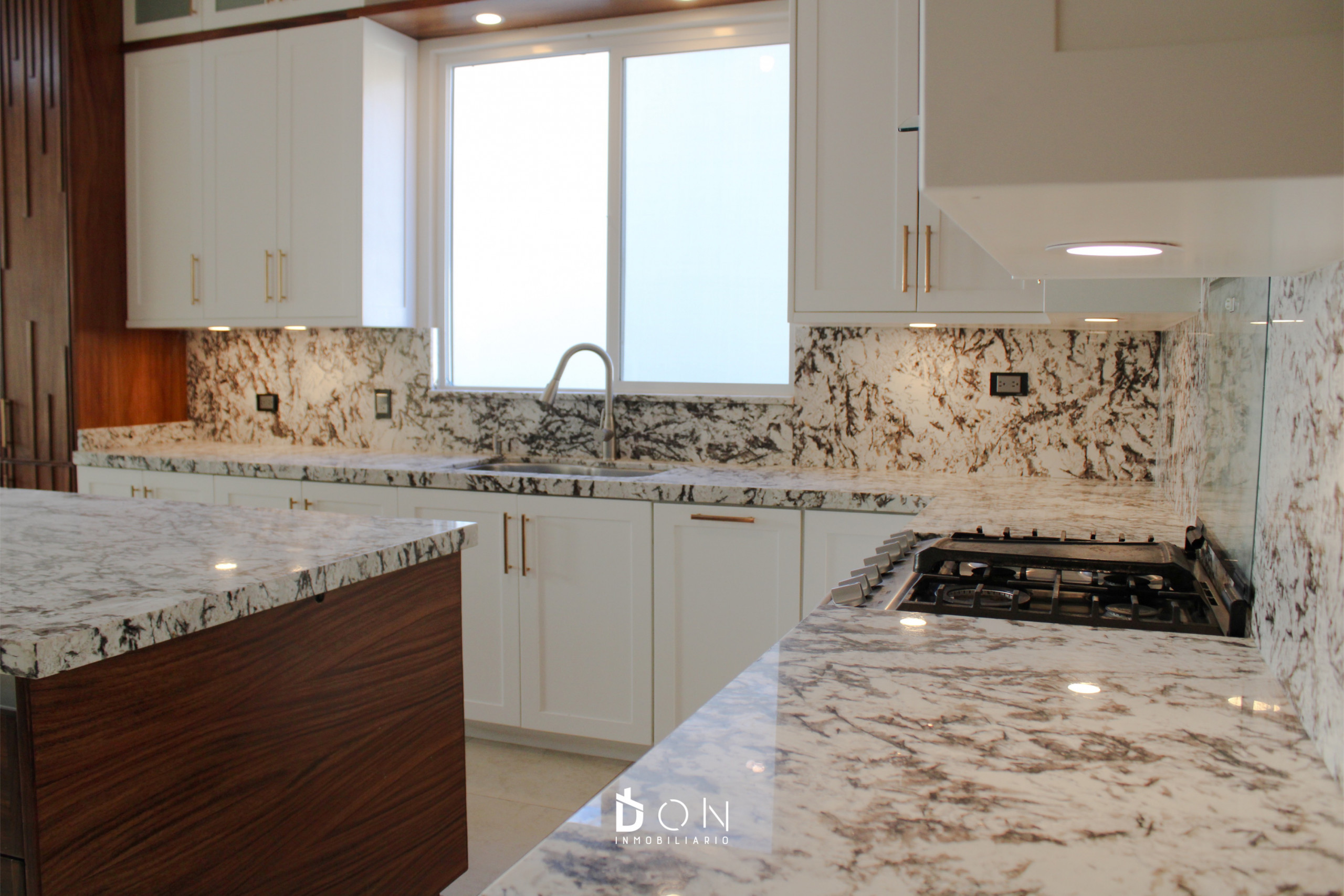 Cocina con barra de granito e isla, estufa y campana, piso rectificado en toda la casa, tres refrigeraciones tipo mini split, boiler, tanque de gas estacionario, rejas perimetrales de protección.