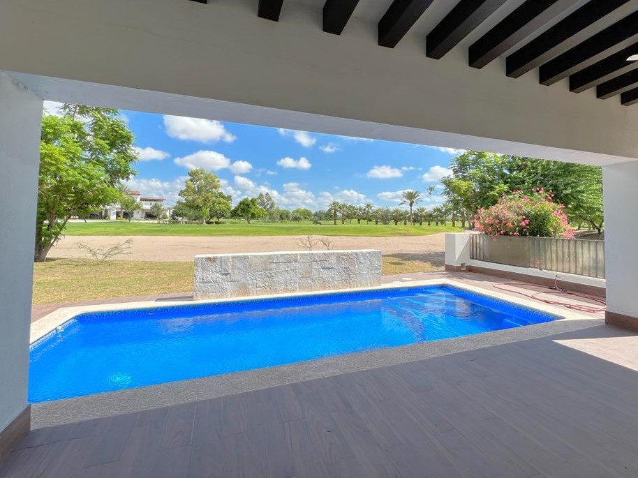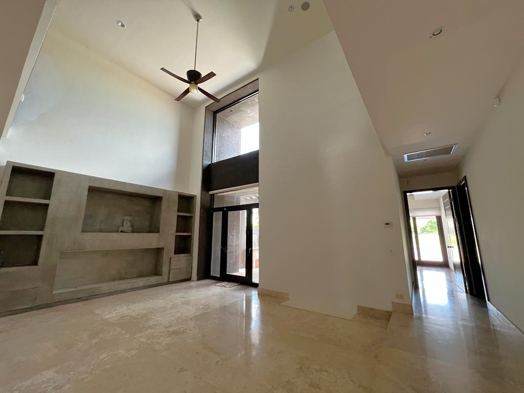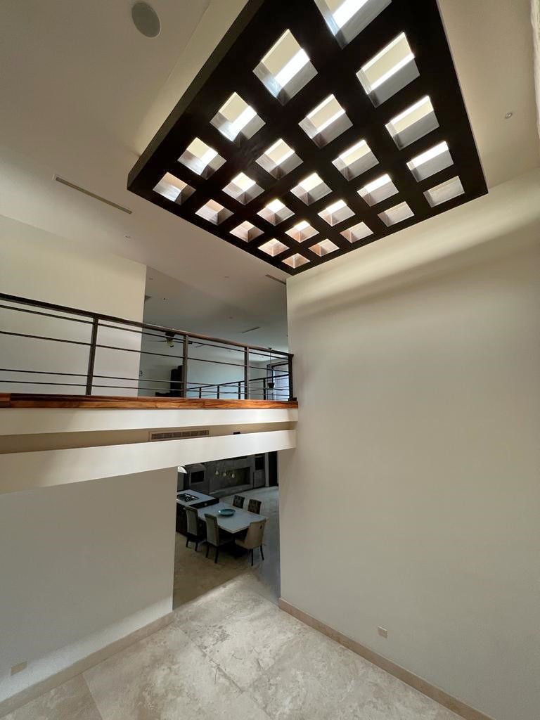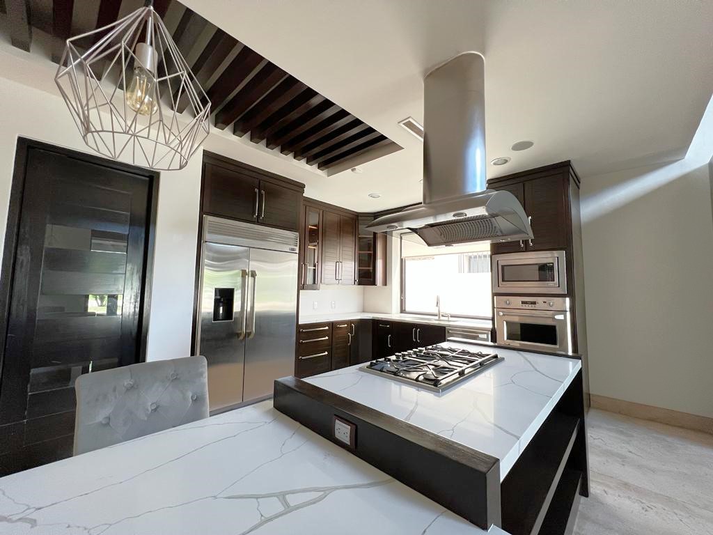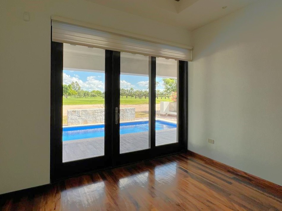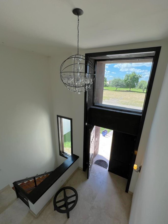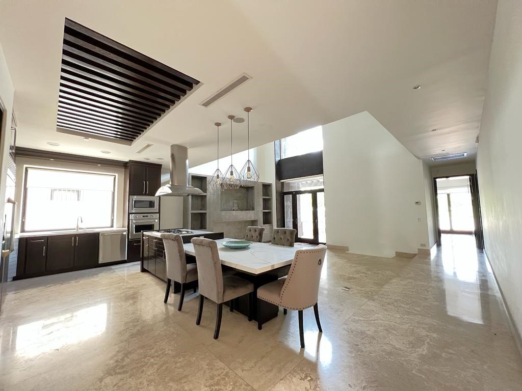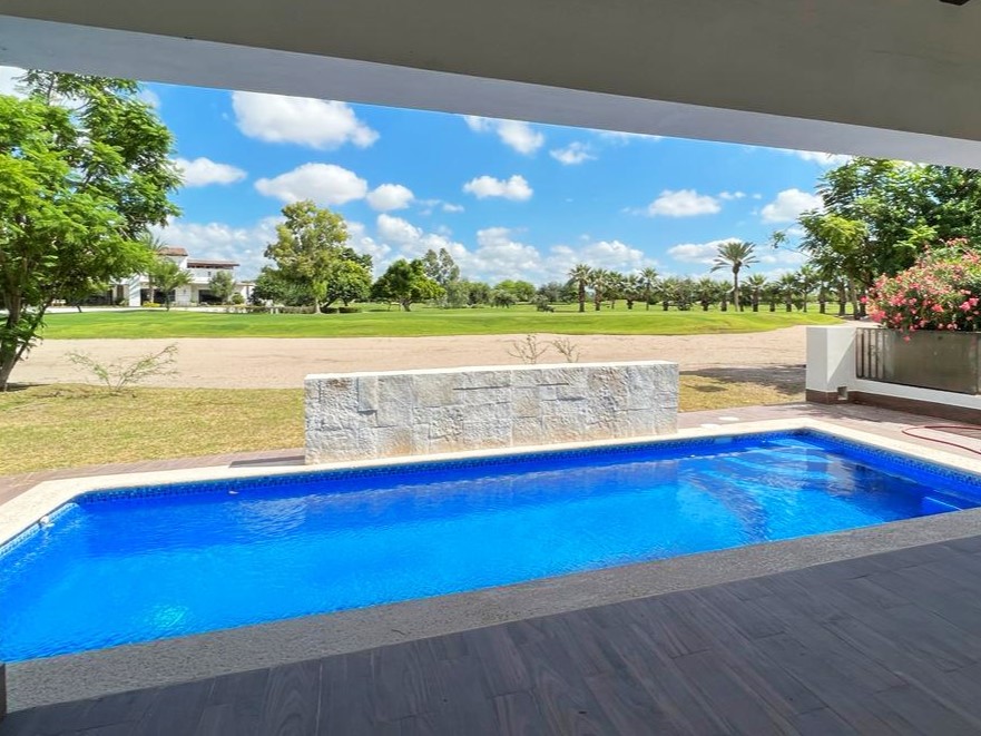 En la planta baja cuenta con jardín frontal, recibidor con triple altura, sala, comedor, cocina moderna y súper equipada, 1/2 baño de visitas, 1 recámara principal con baño y walk in clóset, 2 recámaras con baño completo cada una de ellas, área de lavandería, cuarto de servicio con baño completo, cochera con puerta eléctrica para 4 autos, un gran patio en la parte posterior con alberca, terraza, asador y acceso al campo de golf.