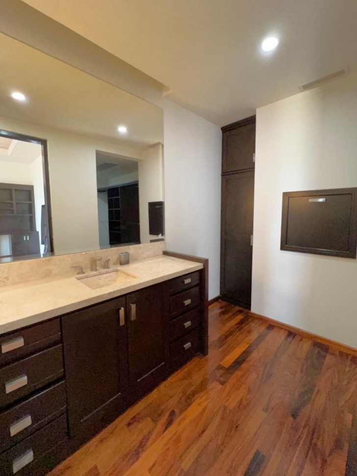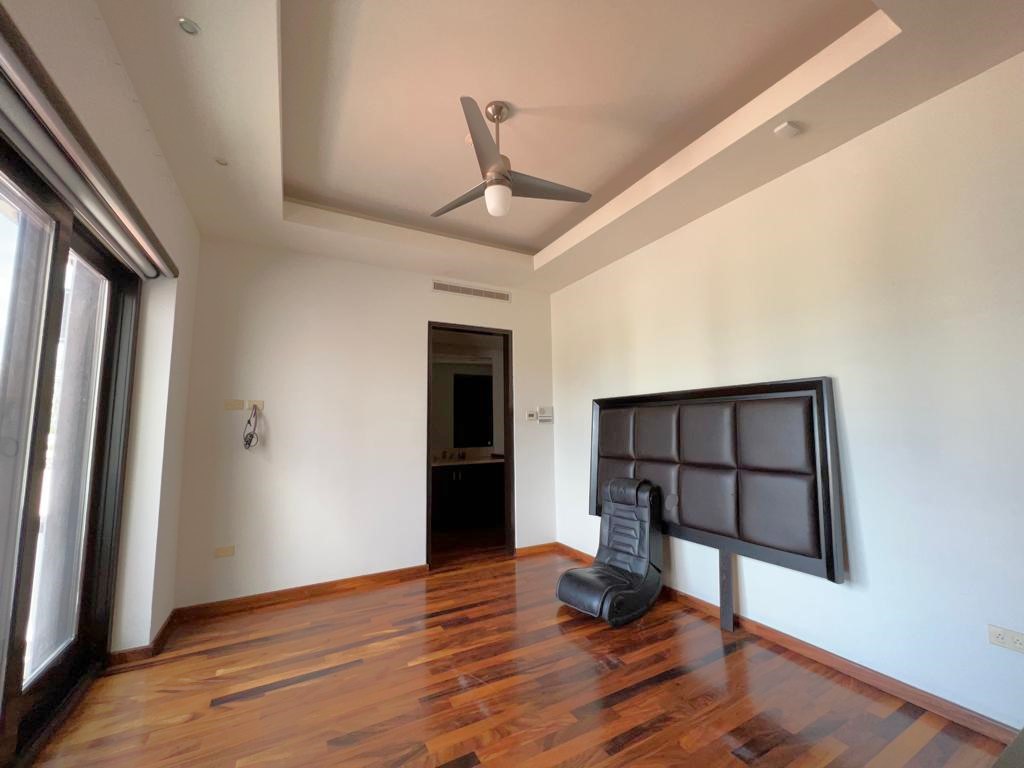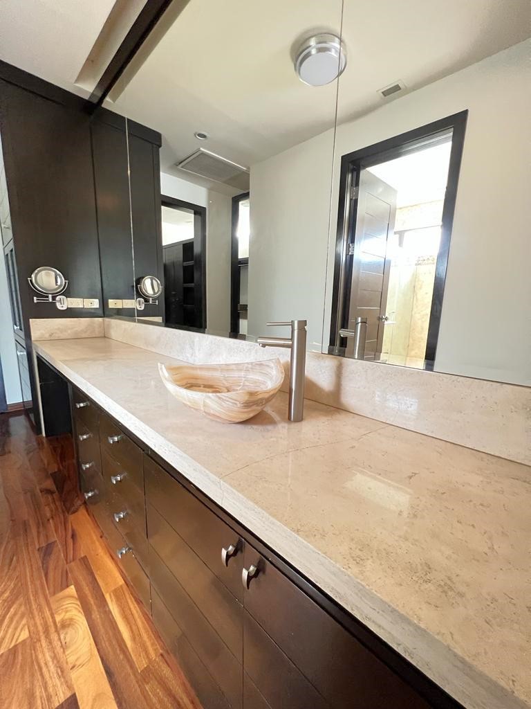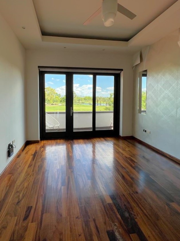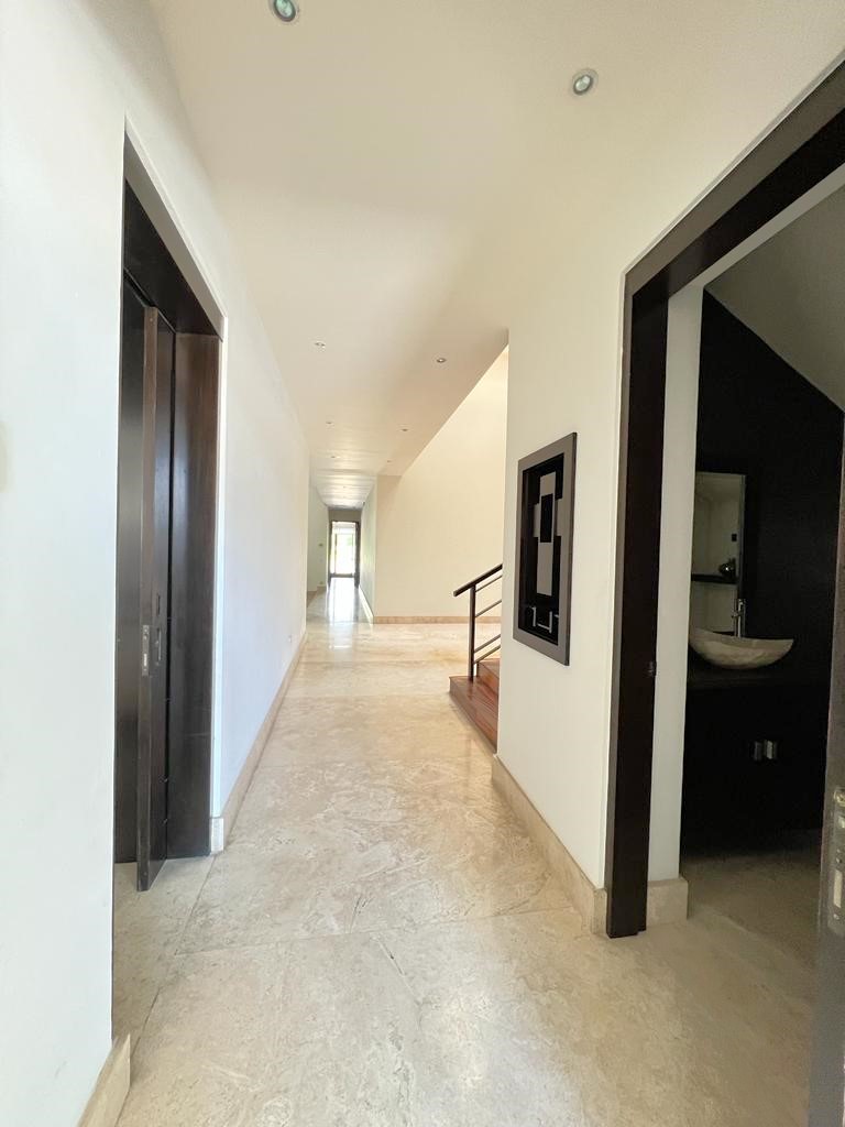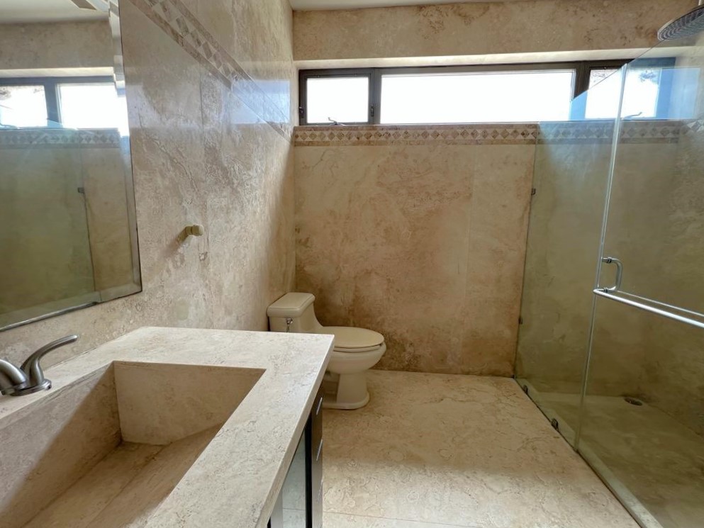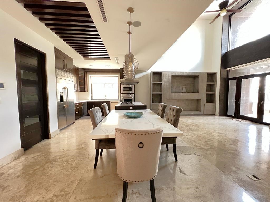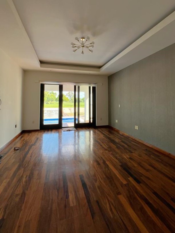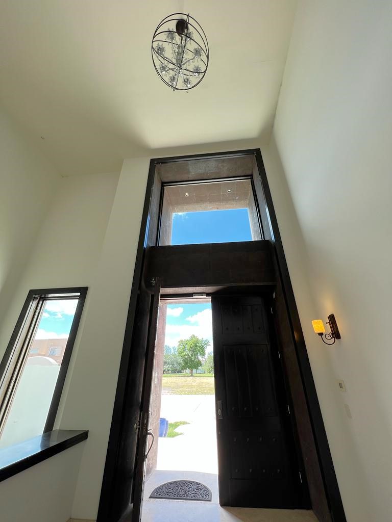 En la planta baja cuenta con jardín frontal, recibidor con triple altura, sala, comedor, cocina moderna y súper equipada, 1/2 baño de visitas, 1 recámara principal con baño y walk in clóset, 2 recámaras con baño completo cada una de ellas, área de lavandería, cuarto de servicio con baño completo, cochera con puerta eléctrica para 4 autos, un gran patio en la parte posterior con alberca, terraza, asador y acceso al campo de golf.