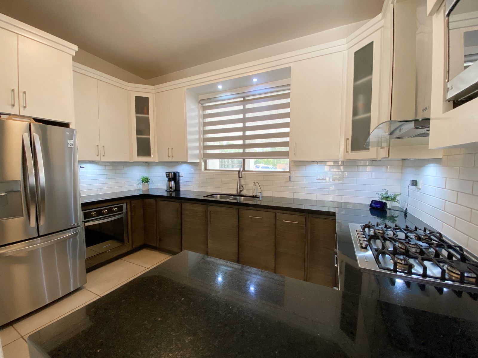 * Cocina integral con barra de granito, estufa, parrilla, campana, microondas y refrigerador.