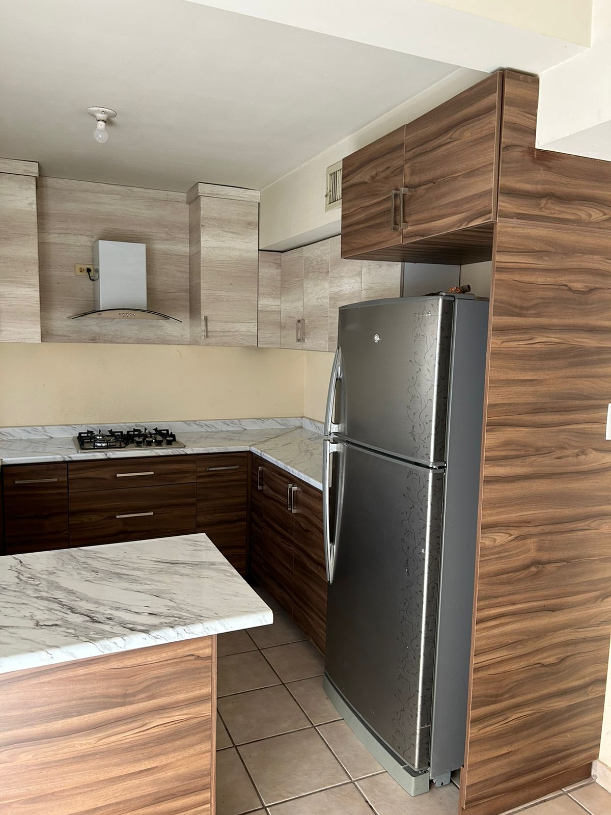 Cocina integral equipada con refrigerador, parrilla, campana con extractor.