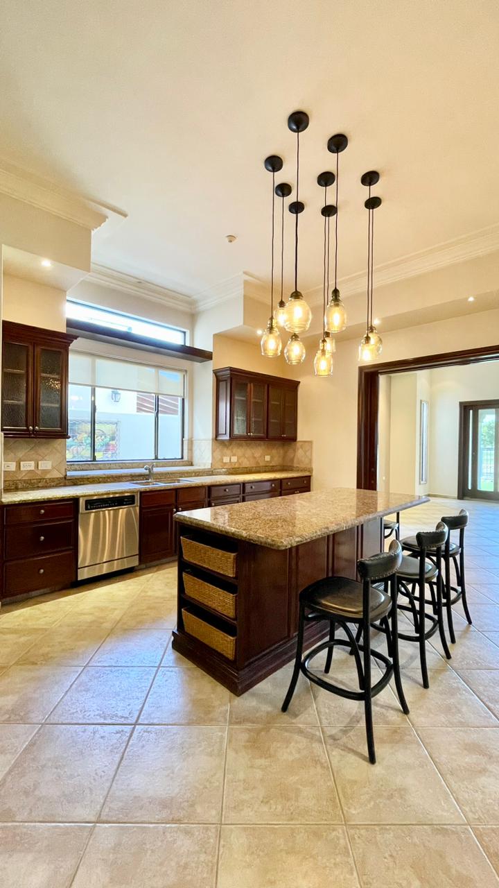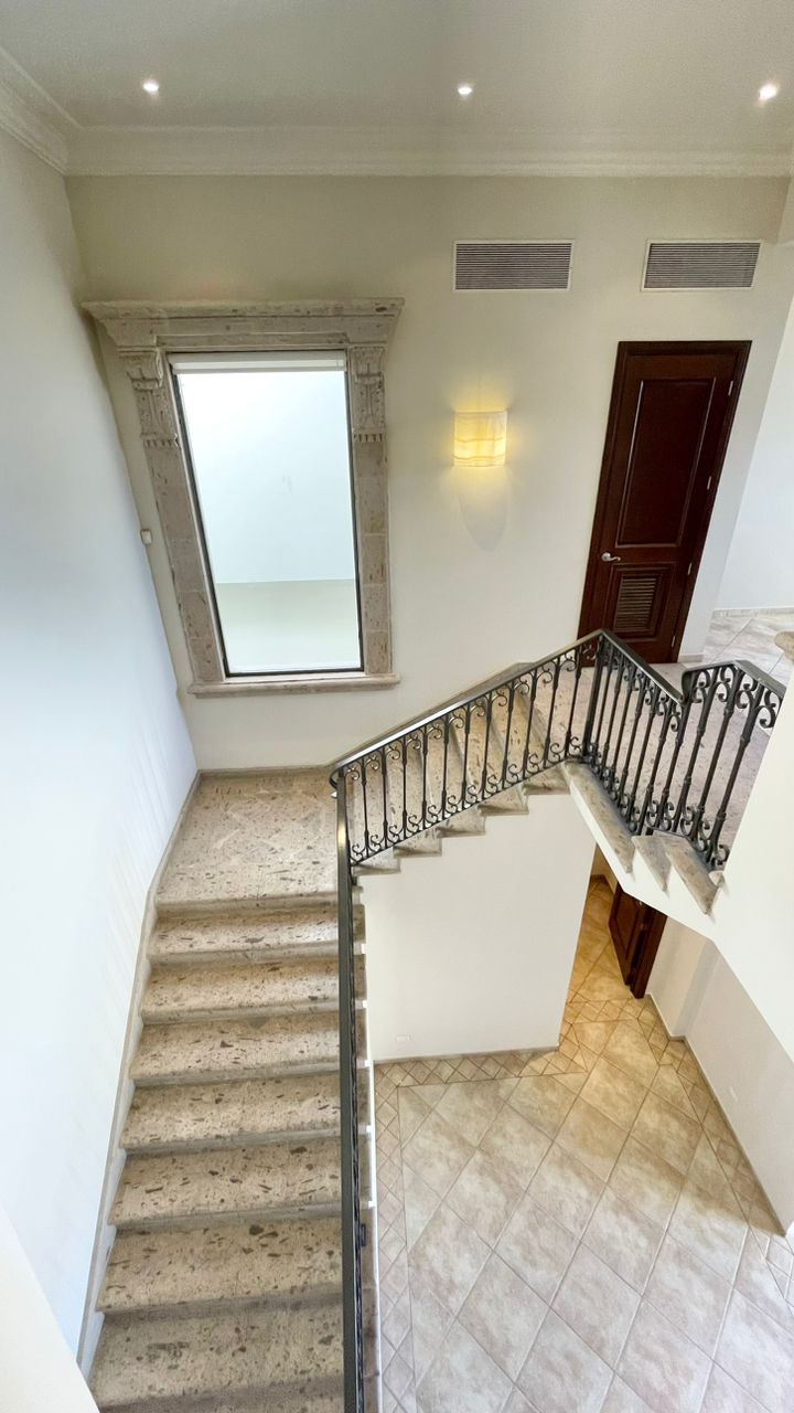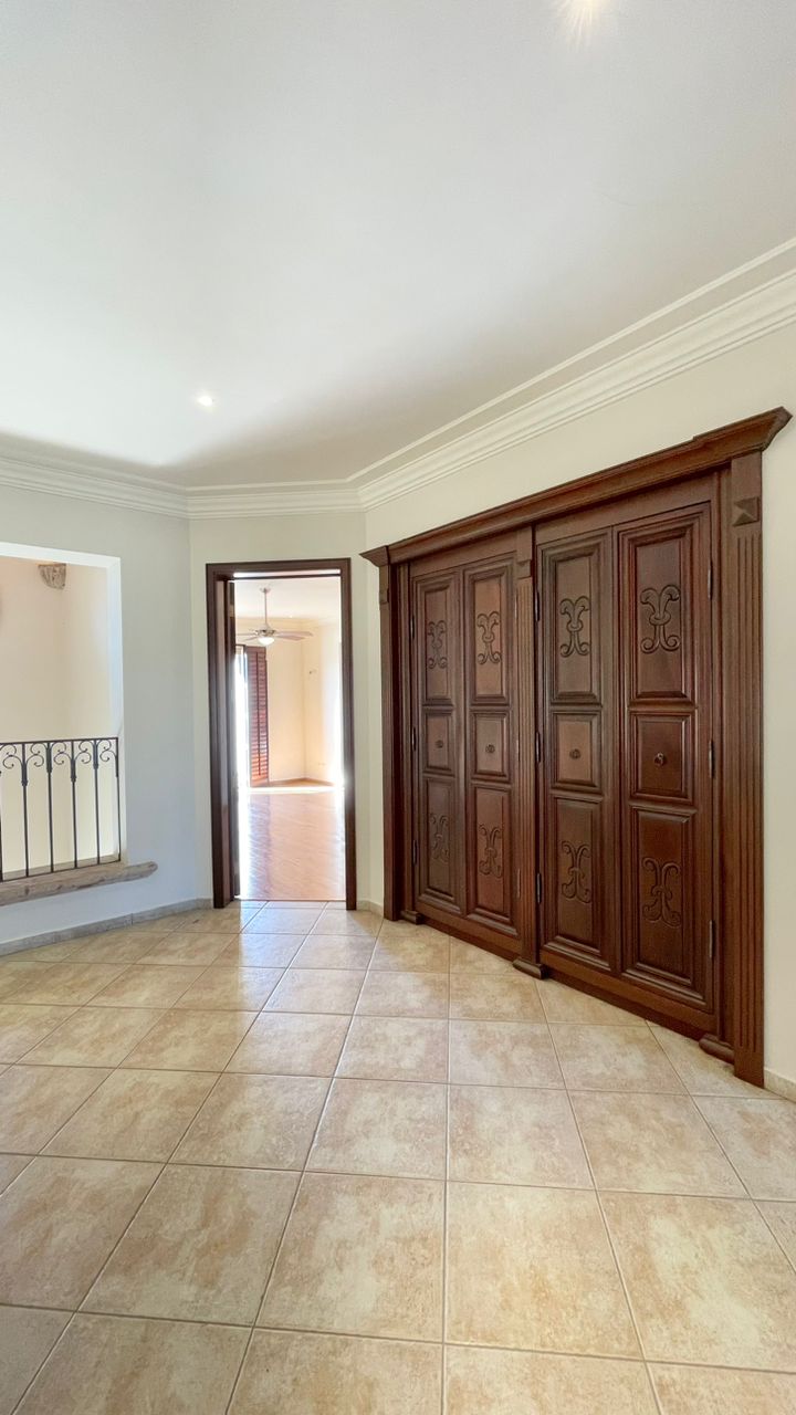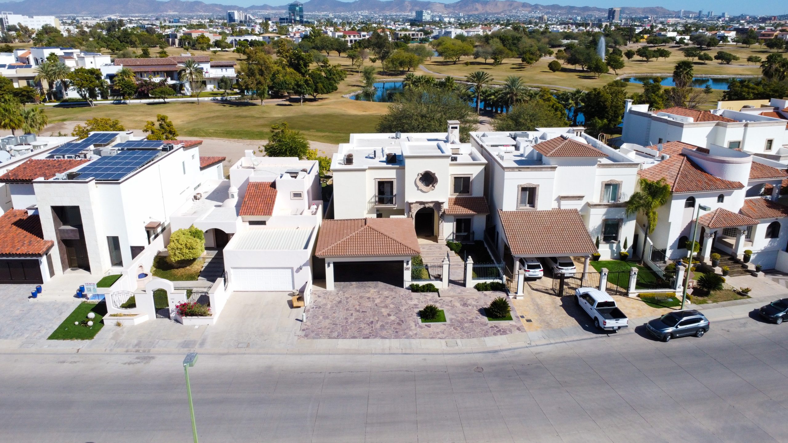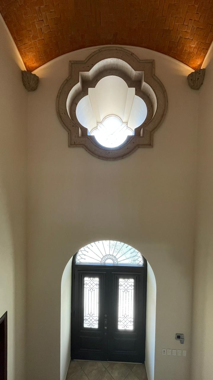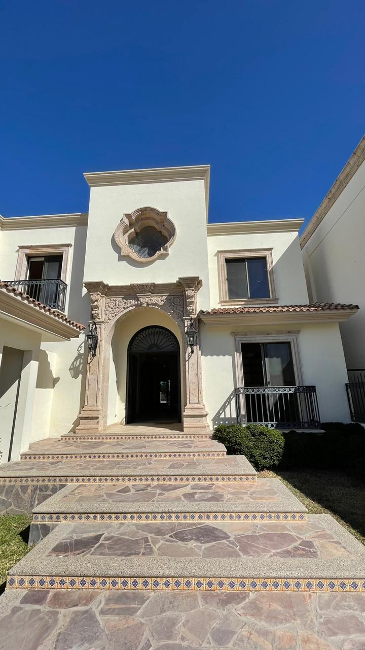 Cuenta con un amplio Jardín frontal, Recibidor, Oficina, Sala con chimenea, Comedor, Cocina, 3 recámaras con baño y walking clóset cada uno de ellas, Estancia, 1/2 baño de visitas dentro de la casa y otro 1/2 baño en patio, lavandería, cuarto de servicio con baño completo, cochera techada y un gran patio en la parte posterior con acceso al campo de golf.
